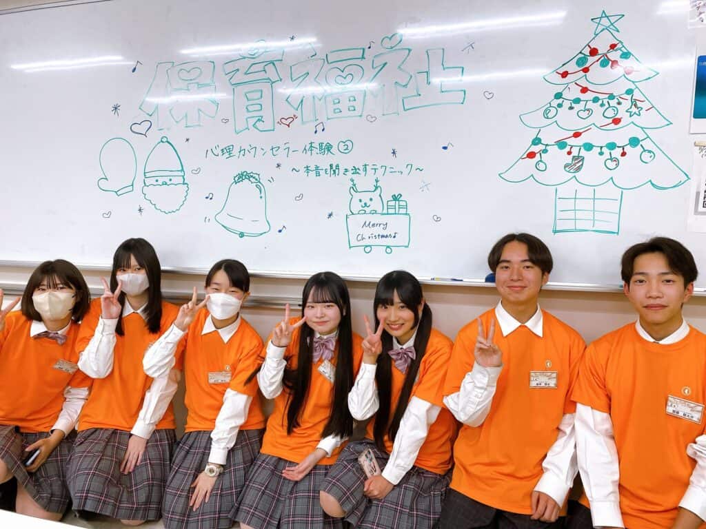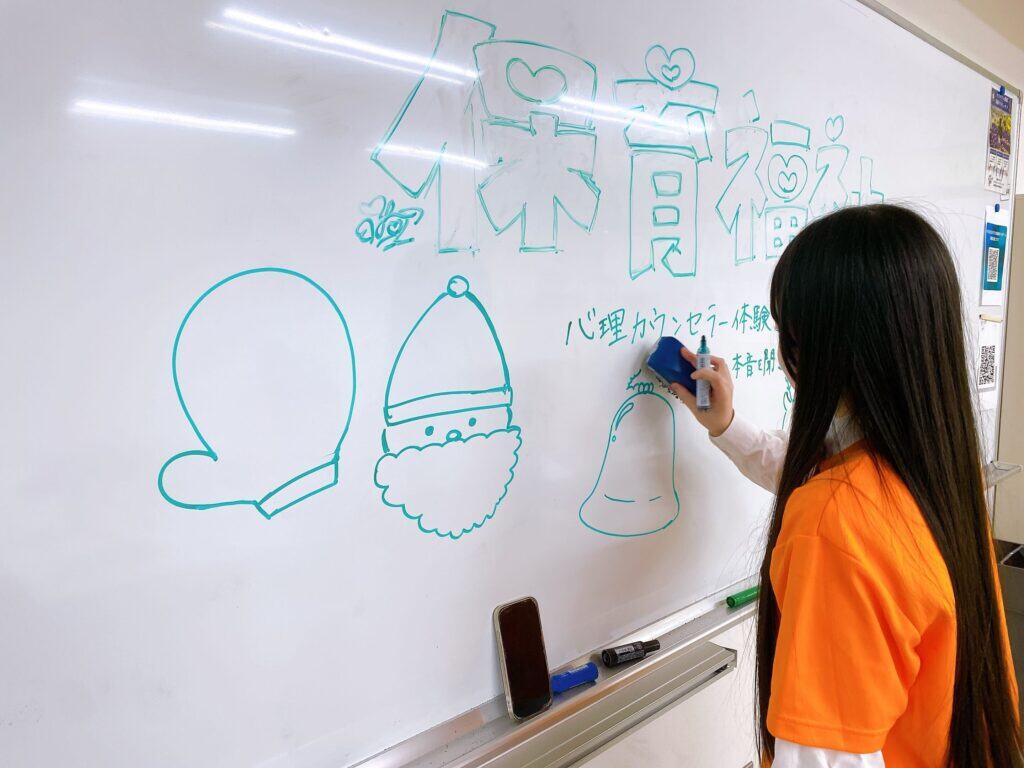 毎回「和やかな雰囲気だった」と来校者の皆さんから大好評の保育・福祉コースのオープンキャンパス。12月6日は、「心理カウンセラー体験③ ~本音を聞き出すテクニック~」を実施しました。在校生たちは保育園の実習で子どもたちからリクエストを受け、練習をしたクリスマス関連のイラストでお出迎え!