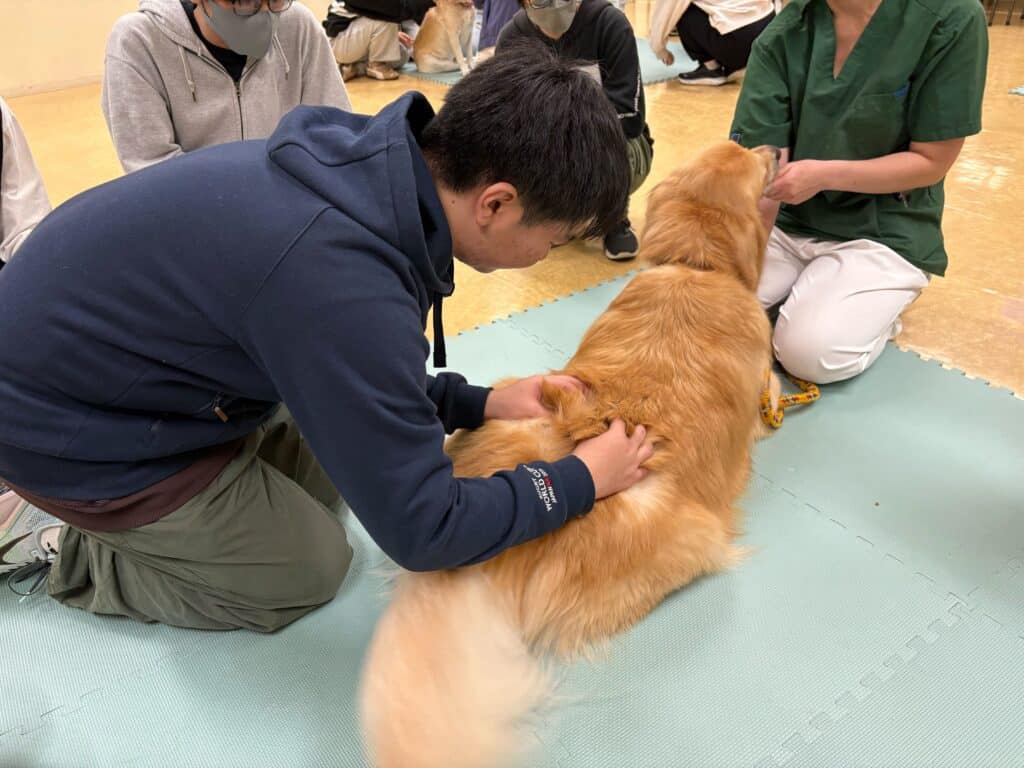 午前の授業では、まず動物リハビリテーションの定義や目的について座学を通して学びました。ケガや病気の治療後だけでなく、動物がその子らしい生活を送るためにリハビリテーションが果たす役割について理解を深めました。続いて、犬の筋肉の構造や筋力の重要性について学習し、どの部位を意識してケアを行う必要があるのかを確認しました。その後、実際にイヌに触れながら、筋肉の状態を感じ取るマッサージの方法を学び、声をかけながら丁寧に実践しました。