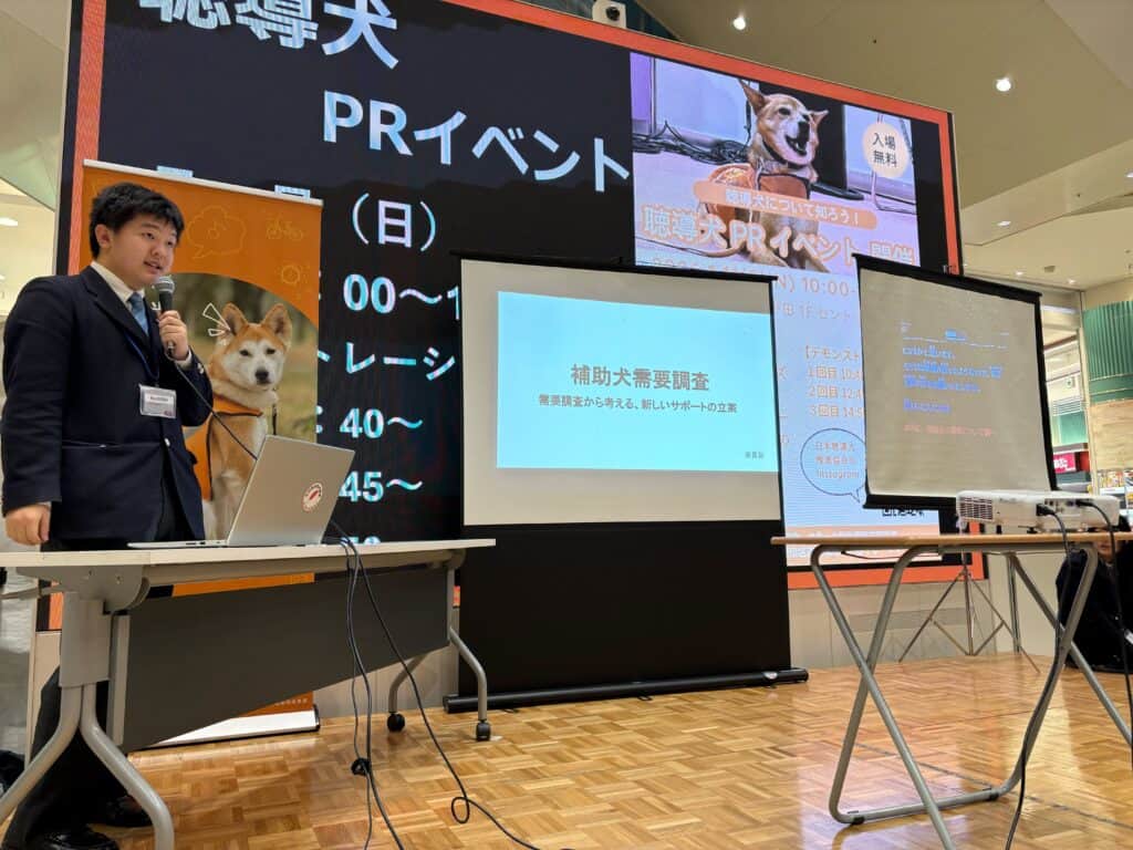 イベントではチャリティーグッズの販売、聴導犬クイズラリー、塗り絵や缶バッジの制作体験、介助学授業での学びの研究発表、募金活動、聴導犬のお仕事のデモンストレーションを行いました。