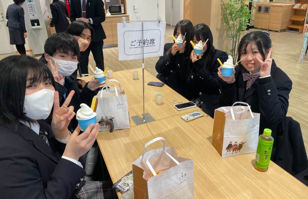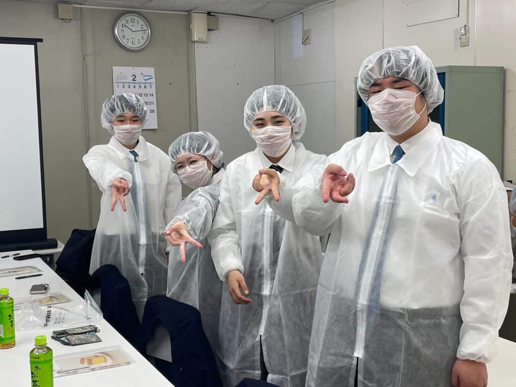 工場内では、カステラが焼き上がる様子や、徹底された衛生管理、そして職人の繊細な手作業を間近で見学。大量生産でありながら、一つひとつ丁寧に仕上げる姿勢に、生徒たちは真剣なまなざしを向けていました。企業として長く愛され続ける理由や、品質を守り続ける工夫について学ぶ中で、「自分たちにできることは何だろう」と自然と考えを膨らませる姿も見られました。