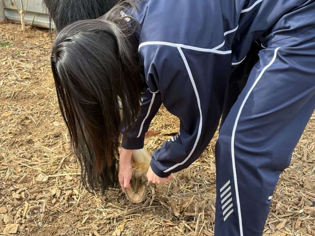 放牧後はブラッシングと裏掘り(蹄の泥取り)を行いました。馬に怪我がないか、普段と違うところはないかを確認する、とても大事な時間です。馬に足を上げてもらうときには、馬に負担をかけないよう速やかに行う必要があります。馬の協力サインを見逃さないよう注意して行いました。また、馬それぞれの性格を理解する機会にもなりました。