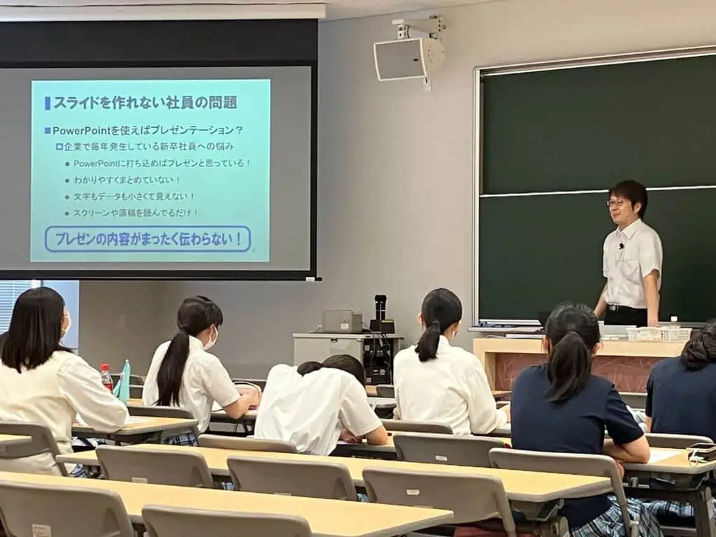 の授業では、スライドの作り方を学びました。情報は、これからの時代どの様な分野においても必ず必要となります。特に、プレゼンテーションを行う際には、必要な情報をわかりやすく伝えるためにどの様なことに気を配れば良いのか、伝わりやすい文字の大きさや種類について学びました。