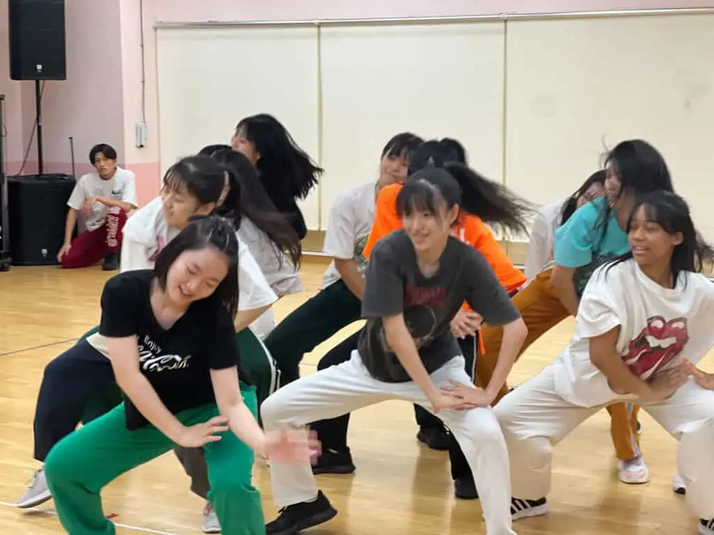 生徒自主制作の振付で2,3年の男女が一人ずつリードをとり、自分たちが考えた振付を参加した中学生の皆さんに丁寧に楽しく教えました。パフォーマンスコースの体験授業はこれまで毎回20組近くのご家庭が参加をしてくださり、ダンス未経験の参加者でも楽しく笑顔になる内容になっています。
