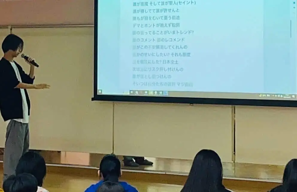 授業では、既成のラップ曲や短歌の歌詞の韻律の美しさ、構成について教授下さり、ラップや詩の奥深さを学ぶ文学的な内容でした。