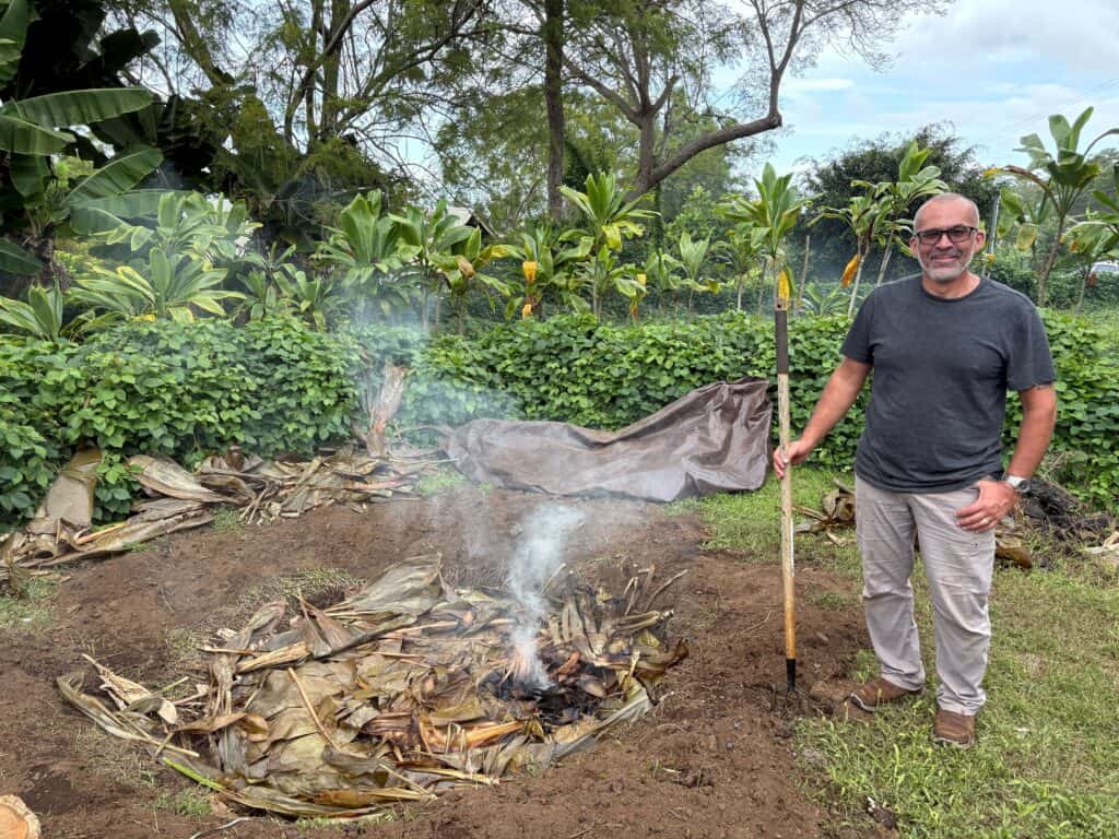 毎日1日の終わりには、キャンプファイヤーを囲み、1日の気づき(ハワイ語でKilo)を共有し合いました。フエフエランチ滞在中には、特別にイムという、地中に掘った穴で食材を蒸し焼きにするハワイ伝統の調理法で、特別にブランチを作成してくれました。