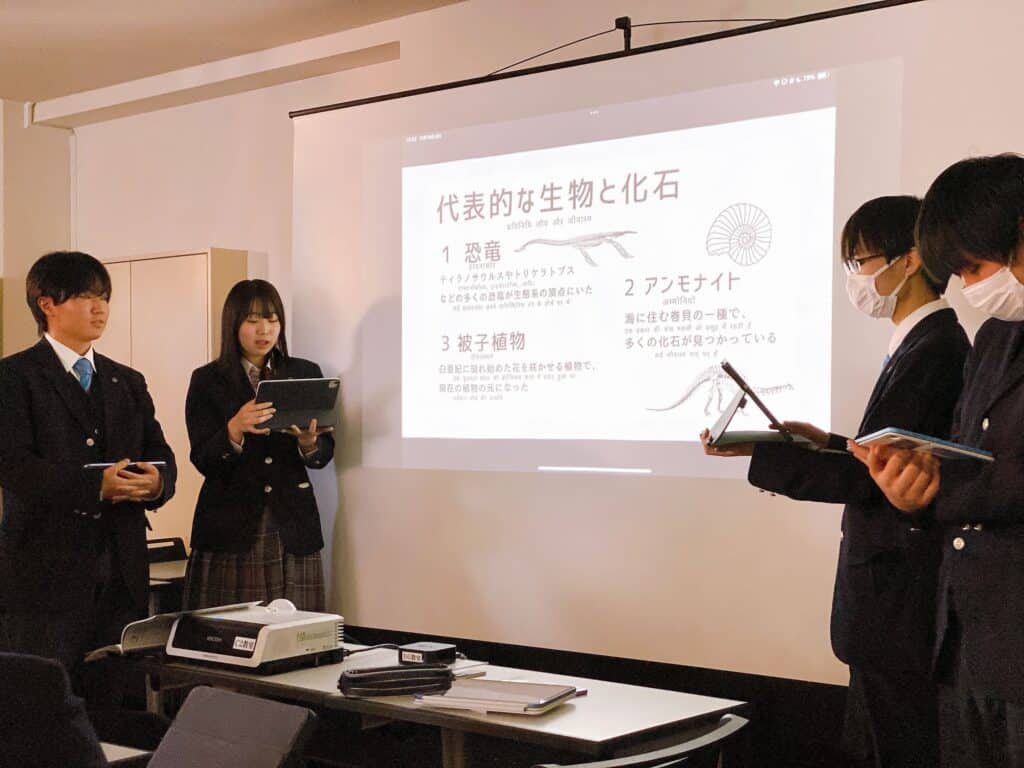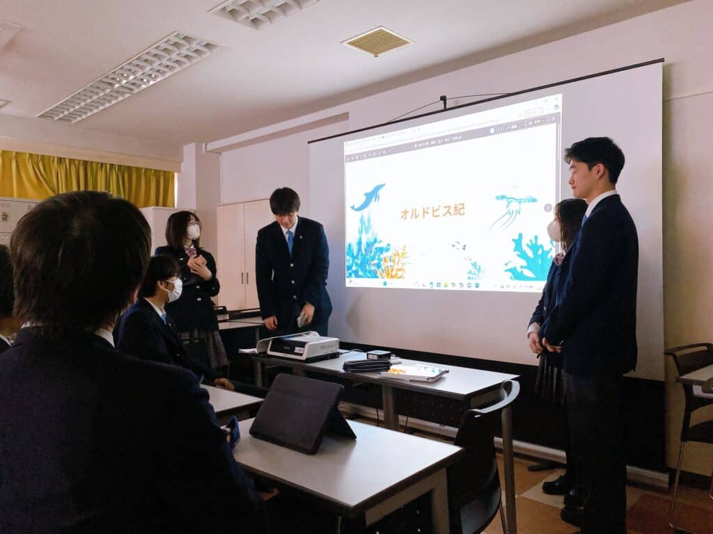 今回は3年生の地学基礎の3クラス合同授業の様子をお届けします。前回の授業で、習熟度クラスを超えて地質時代の調べ学習を行いました。そして、今回は全体に向けてのプレゼンテーションを実施しました。13区分に分かれた地質時代を各班が担当し、自分たちが教科書やiPadを活用して調べ、まとめた内容を発表しました。
