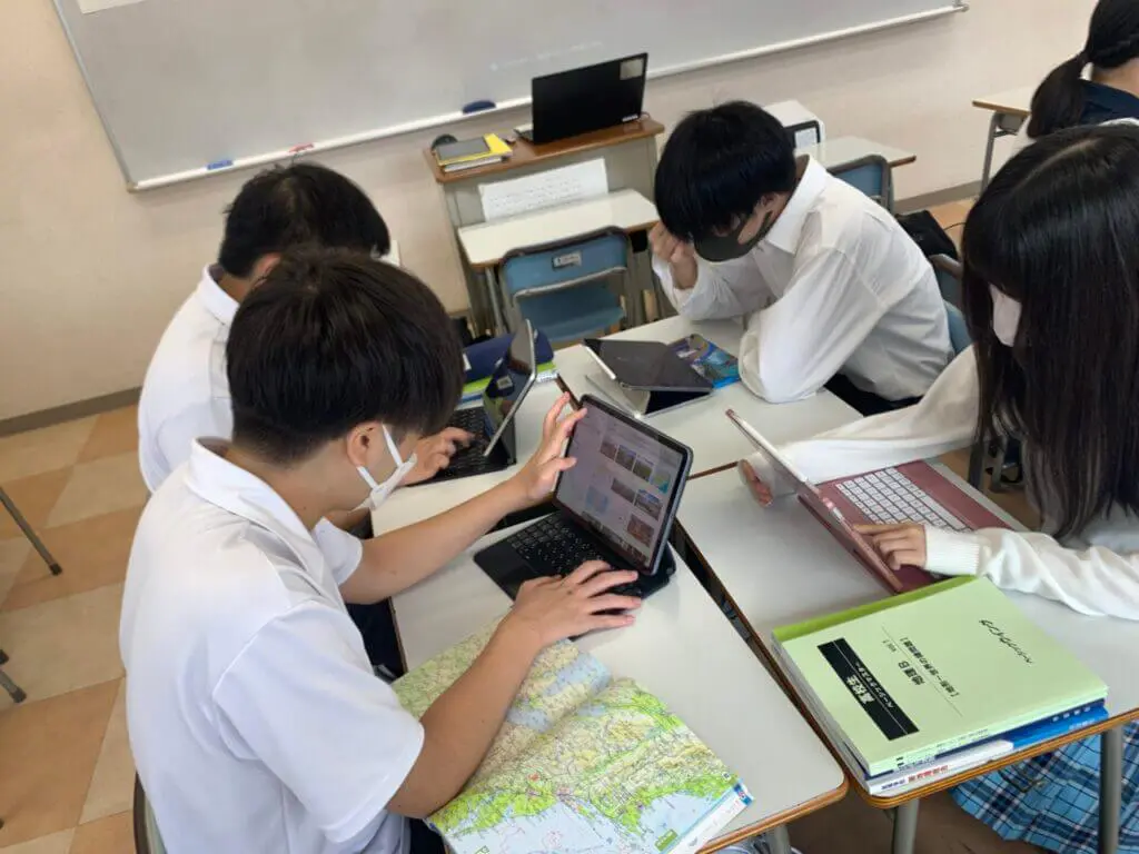 地理総合では、教科書から読み取れる資料を活用しながら、グループごとに色々な検証を行い、発表し、多様性のある意見を論述する活動をしています。