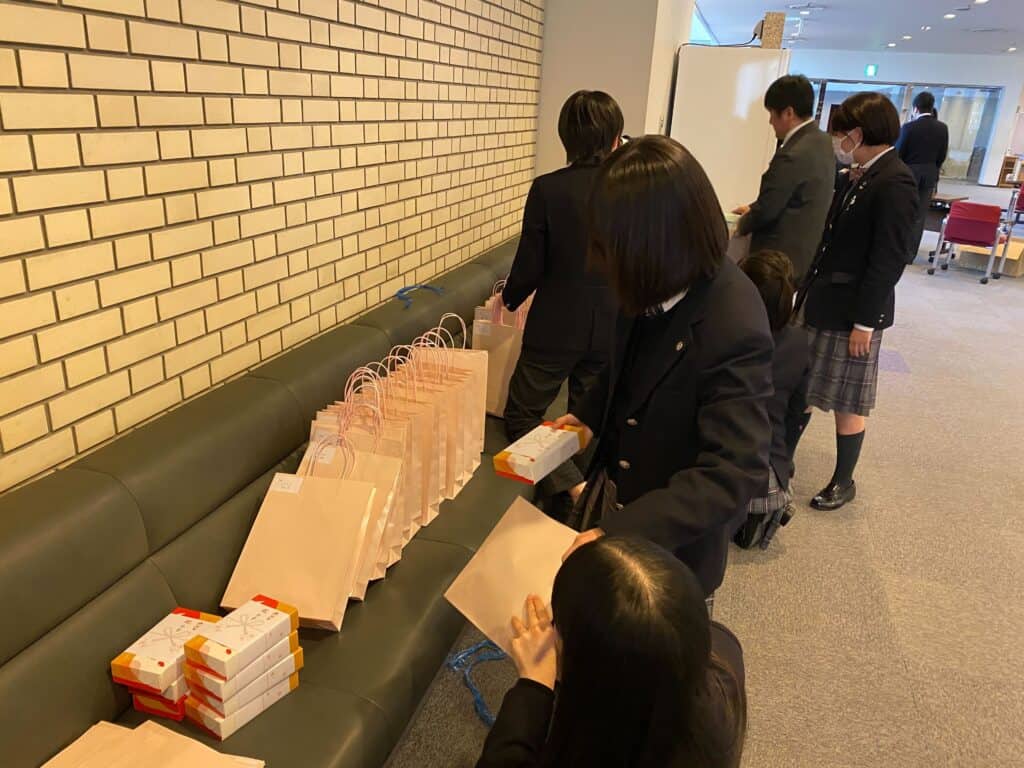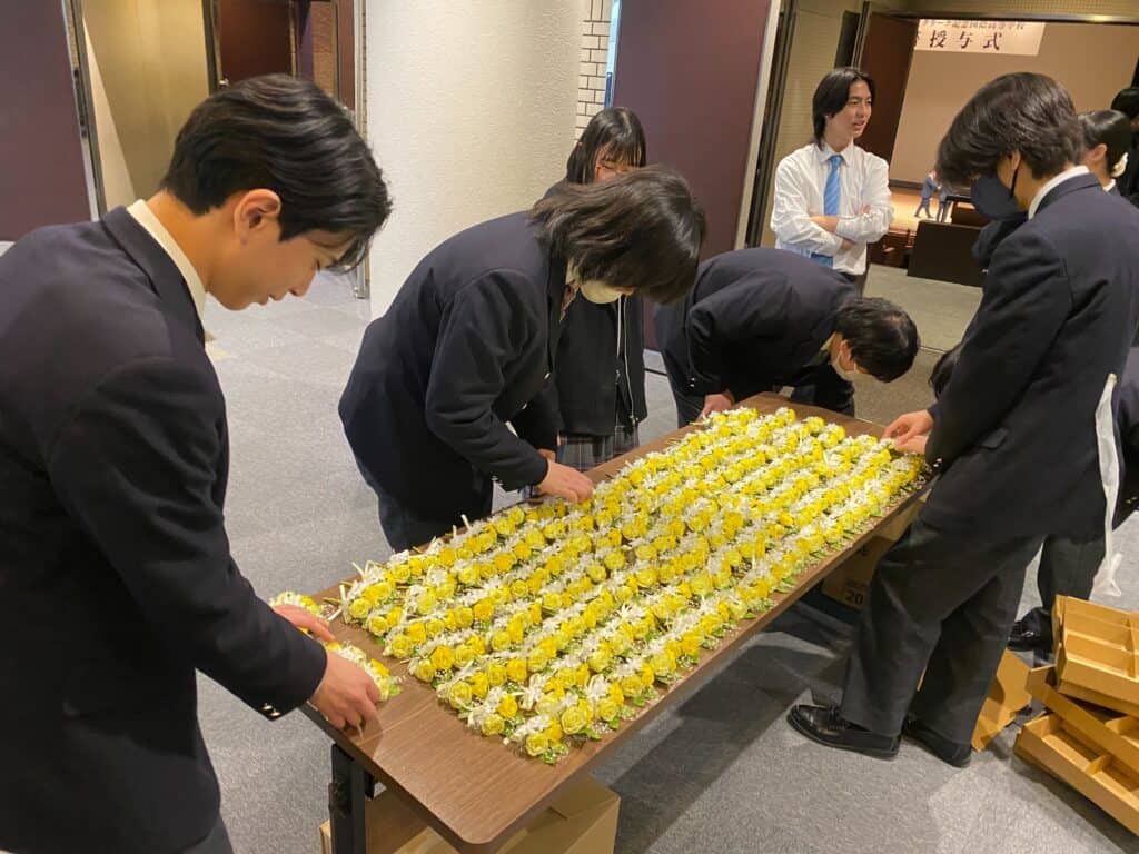 舞台上の備品の動きや、卒業生が胸につける花の準備、また、記念品などの持ち帰りセットを作るなど、式典の裏側まで細やかにサポートしてくれている様子がありました。