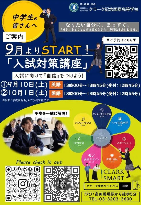 クラーク記念国際高等学校東京キャンパスでは、学校説明会やオープンキャンパスに加えて様々なイベントが開催されています!現在は、「交流会」とともに「コース体験教室」がスタートしています。そして、9月より「入試対策講座」もスタート!ぜひ皆さまご参加ください!