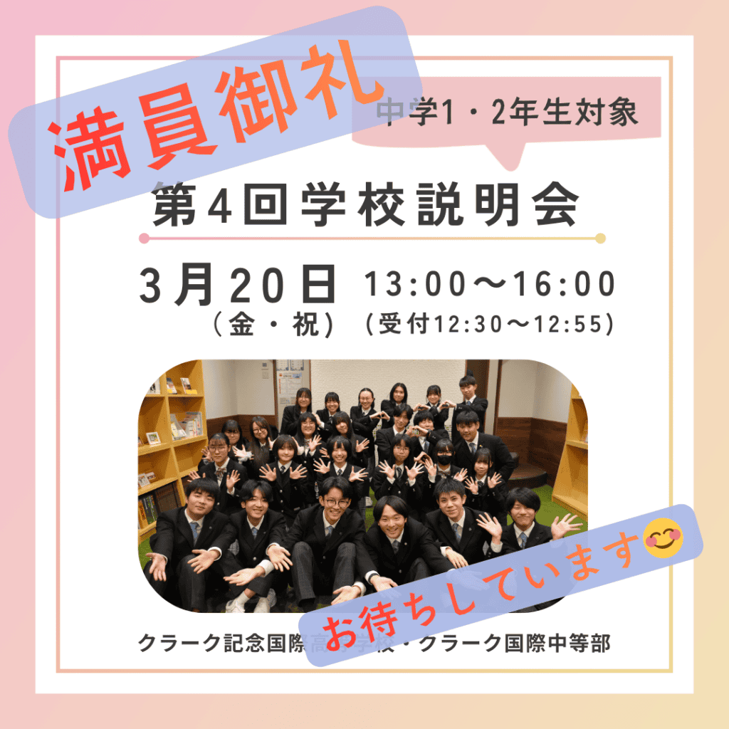 中学1・2年生対象です!学校紹介・コース説明・学校見学だけでなく、実際に在校生と交流できる場をご用意しています。クラーク国際広島のリアルな日常&雰囲気を体験してみませんか?お申込みお待ちしております★ -