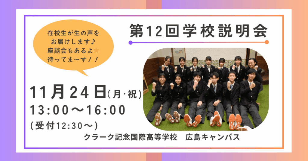 中学3年生対象です!学校紹介・コース説明・学校見学だけでなく、実際に在校生と交流できる場をご用意しています。クラーク国際広島のリアルな日常&雰囲気を体験してみませんか?お申込みお待ちしております★ -