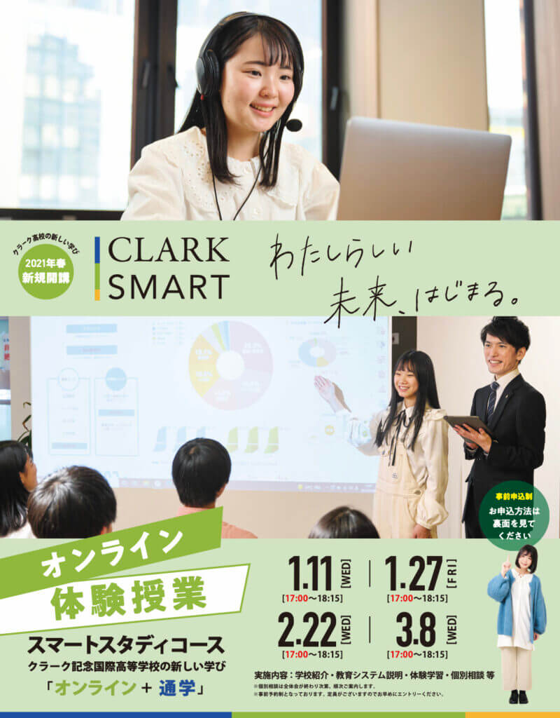 クラーク記念国際高校SMARTコースでは、全国で行われている授業をオンラインで参加することができます!オンラインオープンキャンパスでは、その授業が体験可能です!