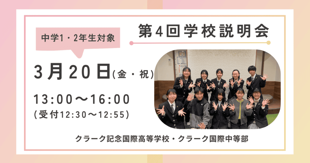 中学1・2年生対象です!学校紹介・コース説明・学校見学だけでなく、実際に在校生と交流できる場をご用意しています。クラーク国際広島のリアルな日常&雰囲気を体験してみませんか?お申込みお待ちしております★ -