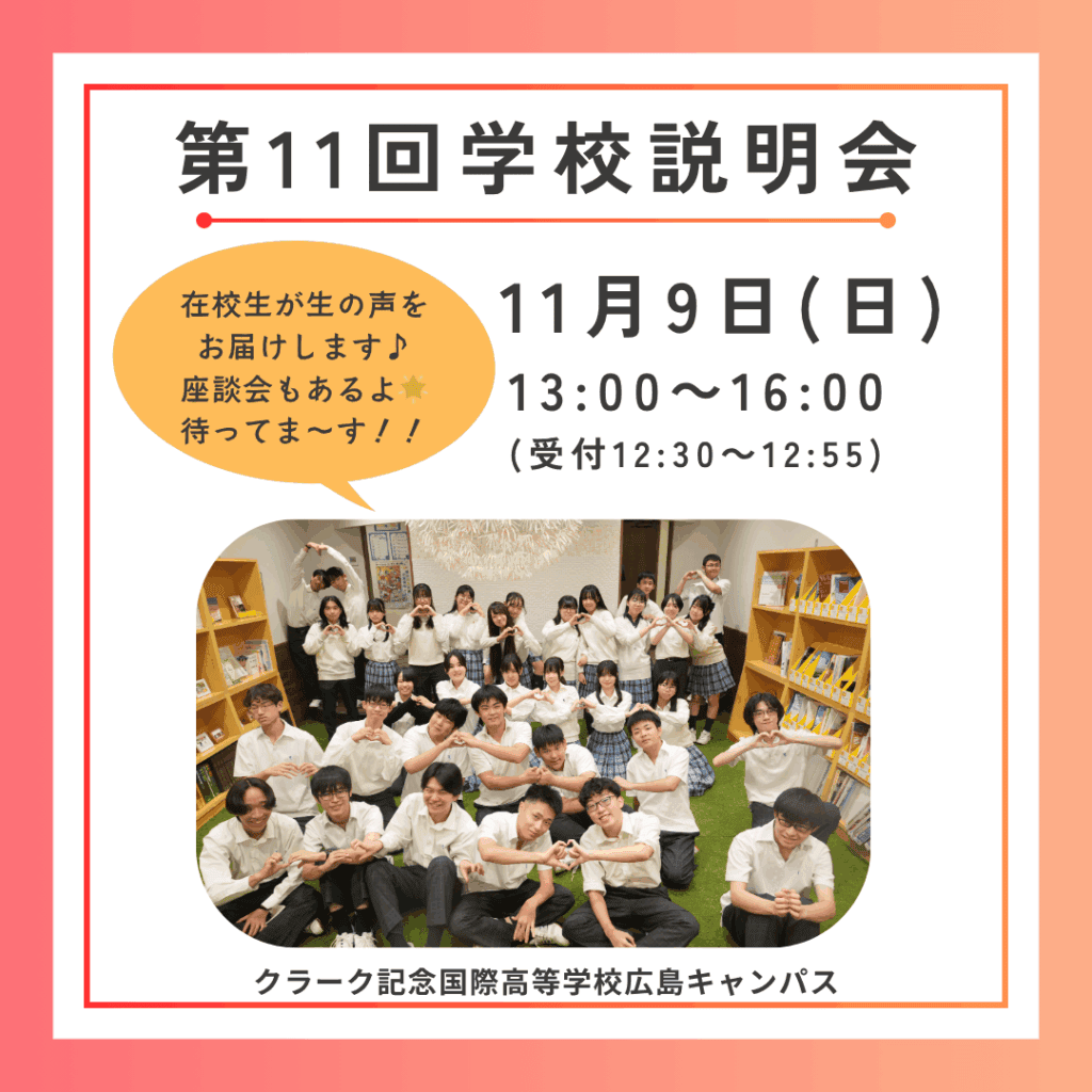 中学3年生対象です!学校紹介・コース説明・学校見学だけでなく、実際に在校生と交流できる場をご用意しています。クラーク国際広島のリアルな日常&雰囲気を体験してみませんか?お申込みお待ちしております★ -