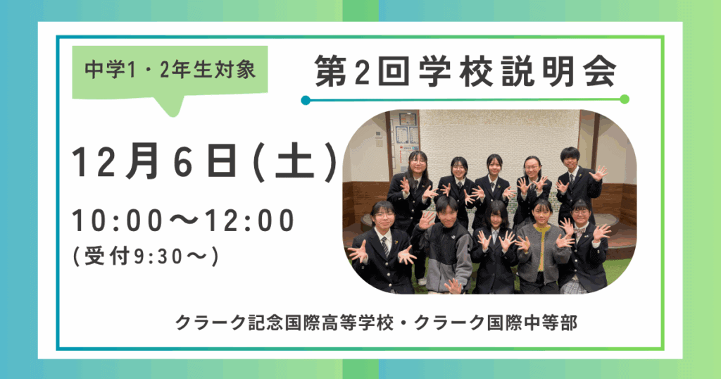 中学1・2年生対象です!学校紹介・コース説明・学校見学だけでなく、実際に在校生と交流できる場をご用意しています。クラーク国際広島のリアルな日常&雰囲気を体験してみませんか?お申込みお待ちしております★ -