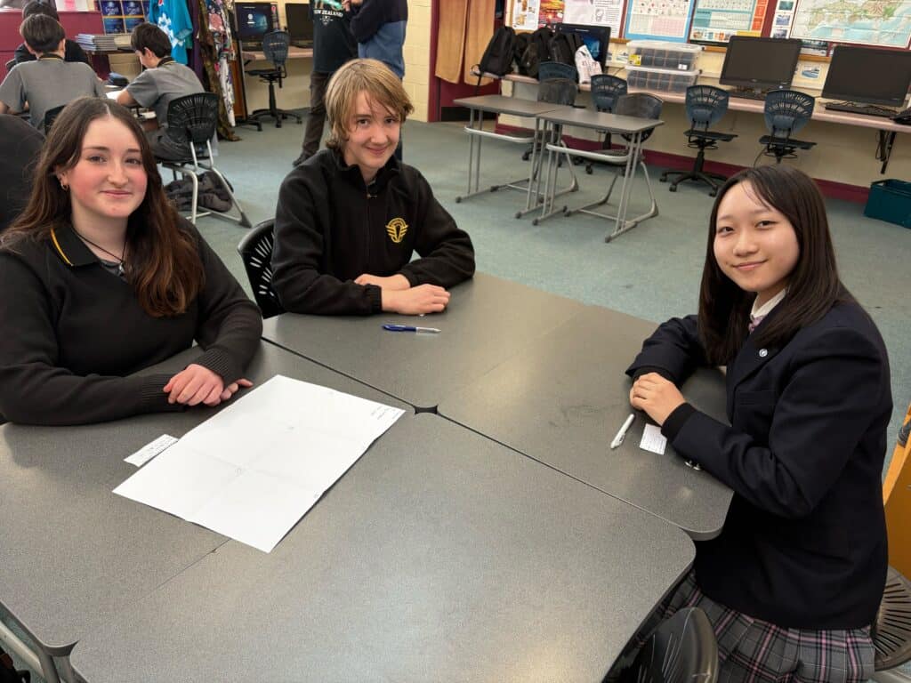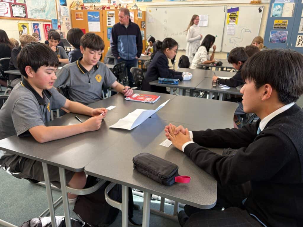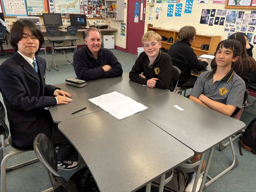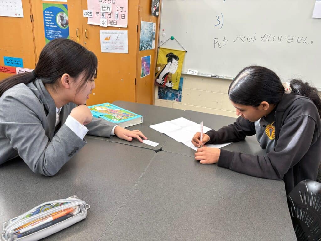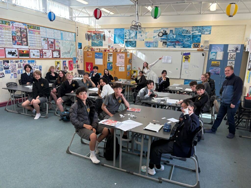 この学校には、日本語を学んでいるニュージーランドの生徒たちが在籍しており、クラーク国際生はその日本語の授業に参加し、「自己紹介」のお手伝いをしました。