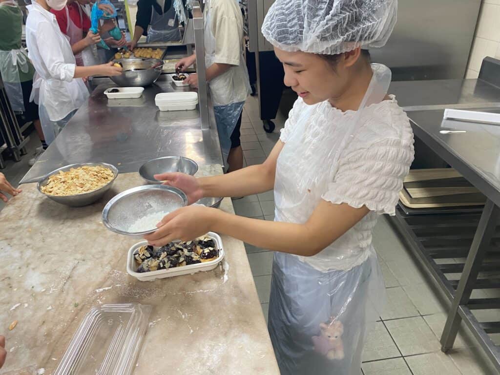 クッキーとシュークリーム作りでは、生徒一人ひとりがしぼり袋で生地を絞ったり、クリームを詰めたり、トッピングのいちごを切ったりと、役割分担をしながら協力して作業を進めました。先生が英語で説明する中でも、わからないことは互いに質問し合い、確認しながら進める姿が見られました。最後まで工程をやり遂げようとする集中力やチームワークが印象的でした。