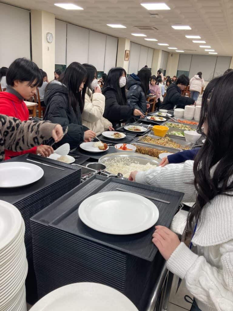 また、就寝前には近くのコンビニへ出かけ、韓国に到着してから初めての買い物にも挑戦しました。これまで学んできた英語とはまた違う難しさを感じながらも、挨拶をはじめ、少しずつ韓国語を使おうとする生徒の姿が見られました。中には、独学で韓国語を学んできた生徒が、早速その語学力を発揮する場面もありました。
