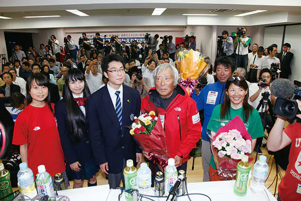 80歳7カ月で3度目のエベレスト登頂成功。壮行会から帰国記者会見、記念式典まで、様々な場面でクラーク生が登頂成功をバックアップした。
