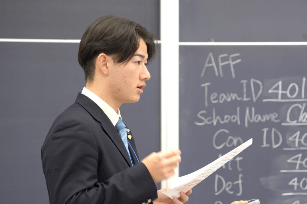 大会では、1試合42分間、肯定・否定の立場に分かれて英語で討論を行います。試合ごとに担当する立場が異なるため、出場生徒は肯定・否定の両方の視点から論題を調べ、事前に十分な探究と準備を行ったうえで大会に臨みました。
