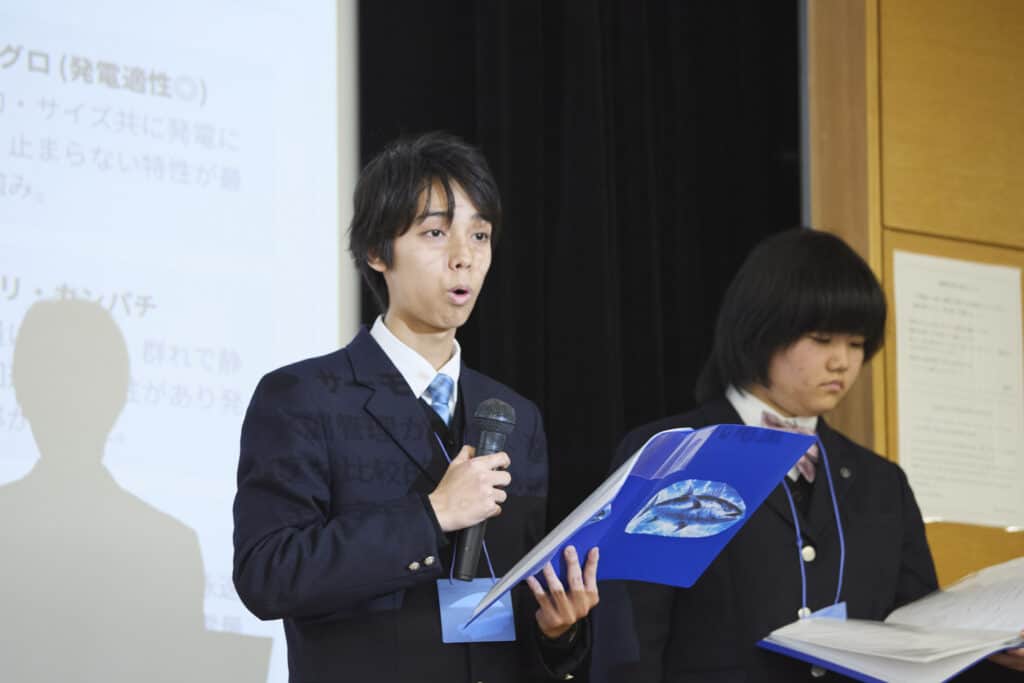 休むことなく泳ぎ続けるマグロの特性に着目。その動きを活用してタービンを回転させ発電を行うという、新しいエコ電力の仕組みを提案しました。自然の力を活かし、持続可能なエネルギー創出を目指す挑戦的なアイデアが高く評価され、準企業賞を受賞しました。