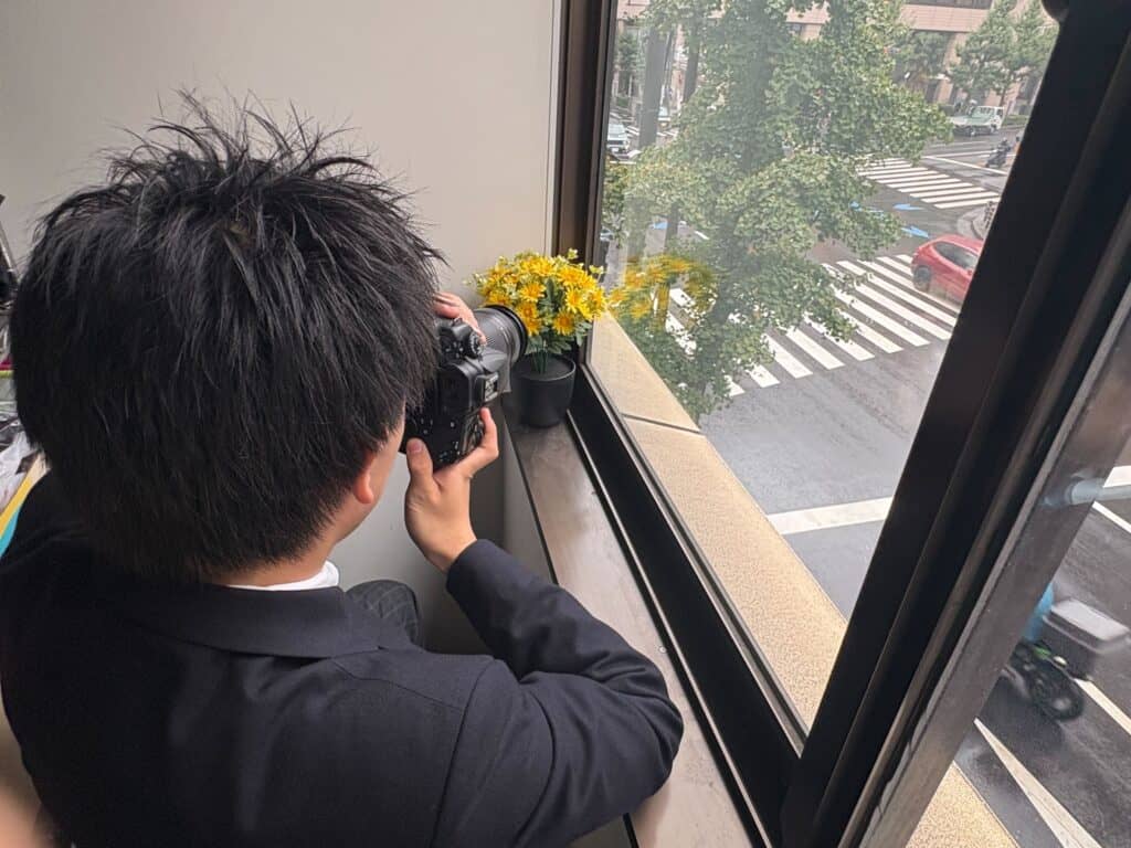 机、いす、三脚、壁に掛けられた賞状、窓際の花…教室にある何気ないオブジェクトも撮り方によって全く違った印象を持ちます。正面から撮るのか、下から撮るのか、カメラはまっすぐか、少し角度を付けるのか…見せ方にはいろいろな工夫ができます。カメラを手先のみで使うのではなく、どうしたら意図や感情が載った作品(写真)になるのか頭と心、そして構図のために全身を使って撮影します。