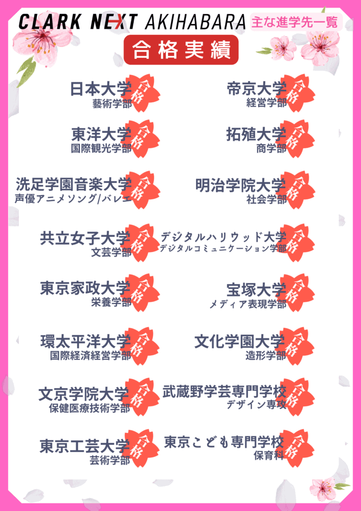 そんなコース教育の成果としてCLARK NEXT Akihabaraを卒業する生徒の進学先は多様な分野となります。