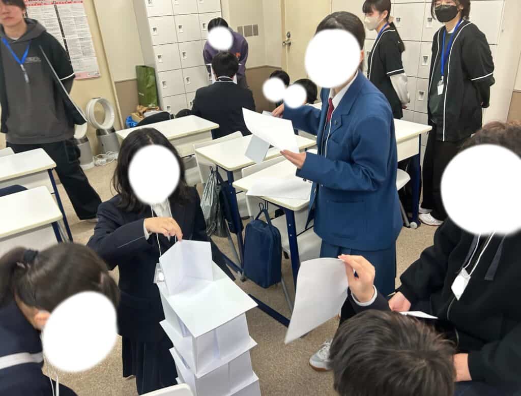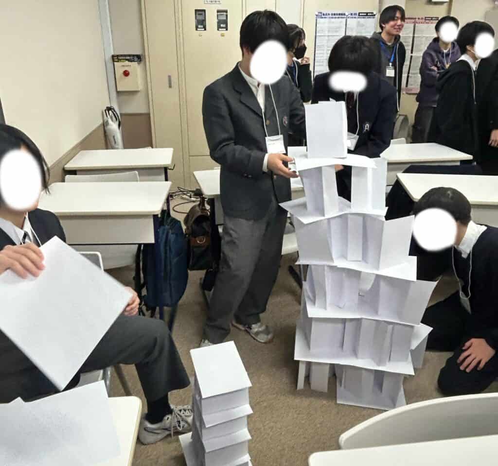 前回の合格者学習会では、グループに分かれて「ペーパータワー作り」に挑戦しました!