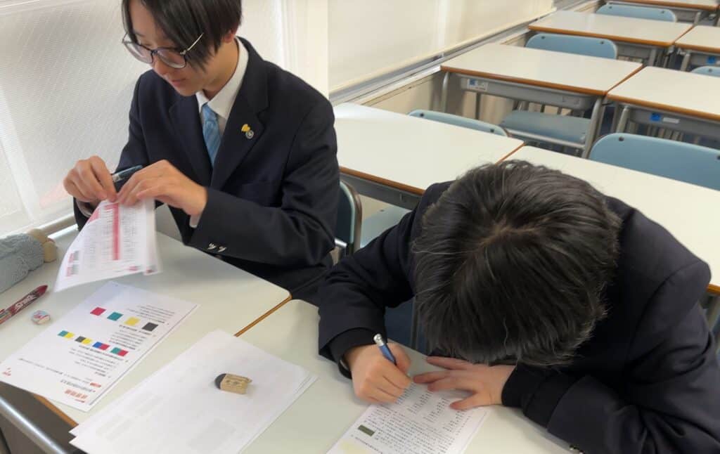 水曜日の選択授業の一つに「色彩検定(内閣府認定公益社団法人 色彩検定協会)」の検定対策授業があります。授業では、テキストやプリント、配色カードと色彩検定協会の解説動画をもとに学習に取り組んでいます。