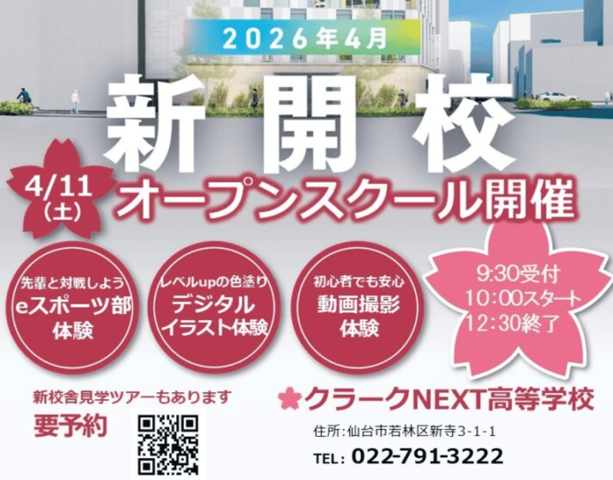 いよいよ4月に開校を迎えるクラークNEXT高等学校!中学3年生対象に第1回オープンスクールを開催します! 新校舎の見学ツアーも開催します。3つの体験授業から1つを選んで、…