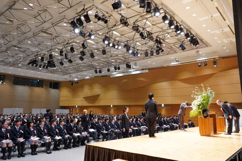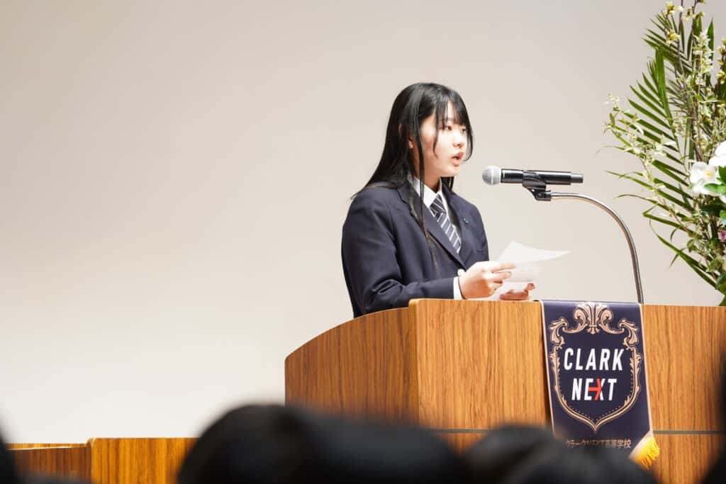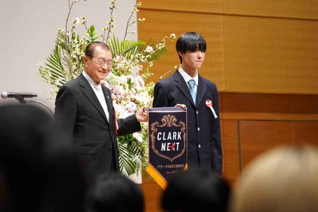また、入学式では在校生から新入生へクラークのスピリッツを伝承するセレモニーが行われました。スピリッツ伝承式は、毎年行われ先輩たちが新しい仲間を迎え入れる儀式でもあります。校章とクラークNEXT高等学校1期生の証であるNEXTバッチが贈られました。新入生も仲間入りし、新しい校舎での学校生活がスタートします!