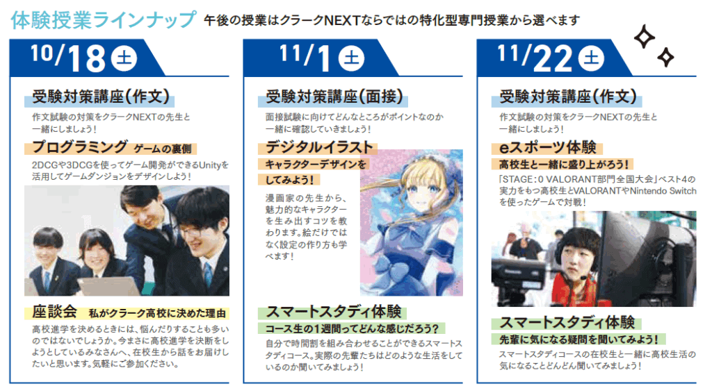■午後の部として各分野の体験授業をご用意しております。学校説明会とあわせて参加を希望される場合は、ご予約時に体験授業をご選択ください。