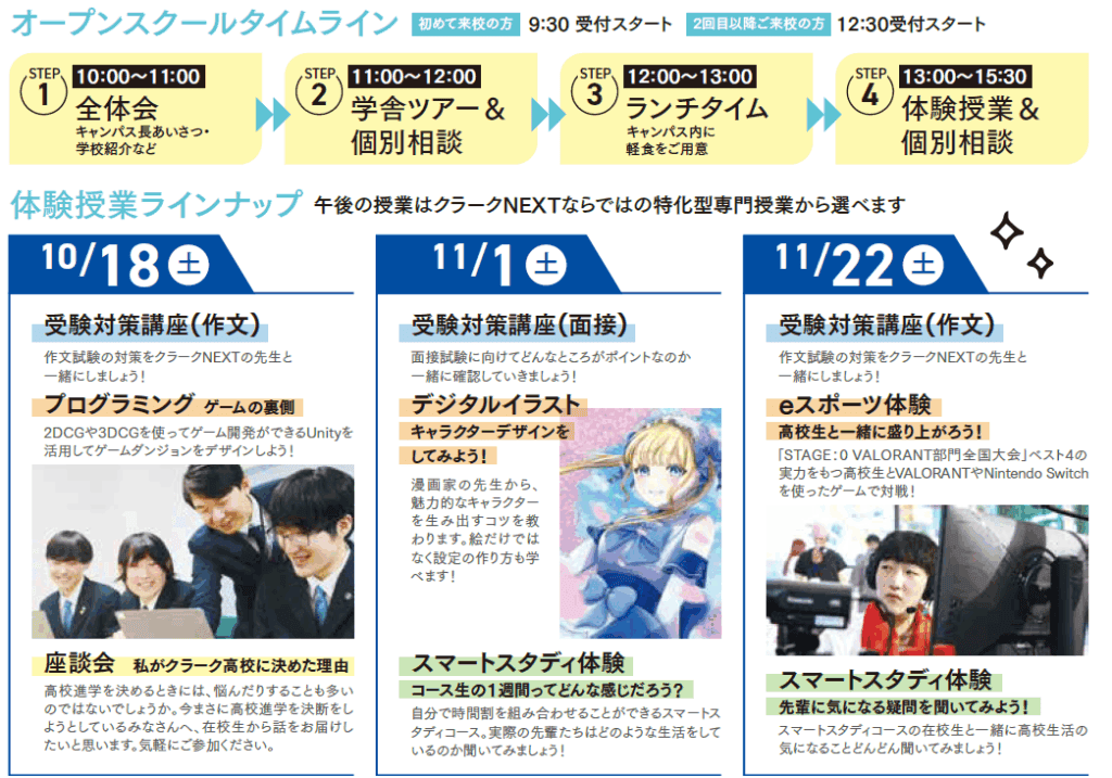 10月18日(土)10:00~中学生対象のオープンキャンパスを開催いたします。オープンキャンパスではクラークの学校説明の他に、体験授業にご参加頂けます。この機会にクラークの特色ある授業を体感してみませんか?
