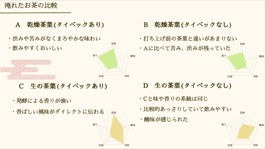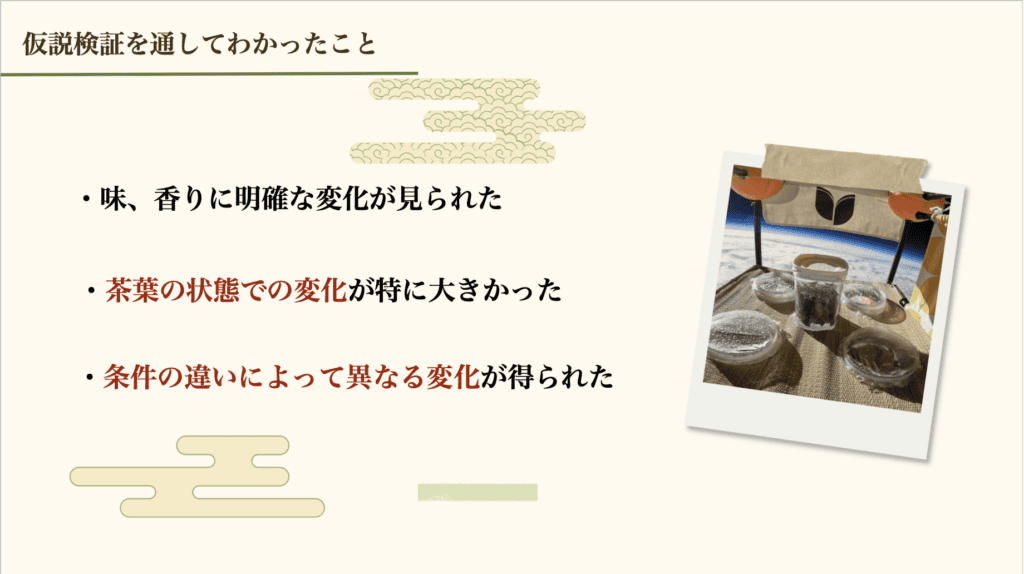 打ち上げ後の評価では、味・香りに明確な変化が確認され、特に抽出する前の茶葉で検証した場合の変化が大きいことが分かりました。