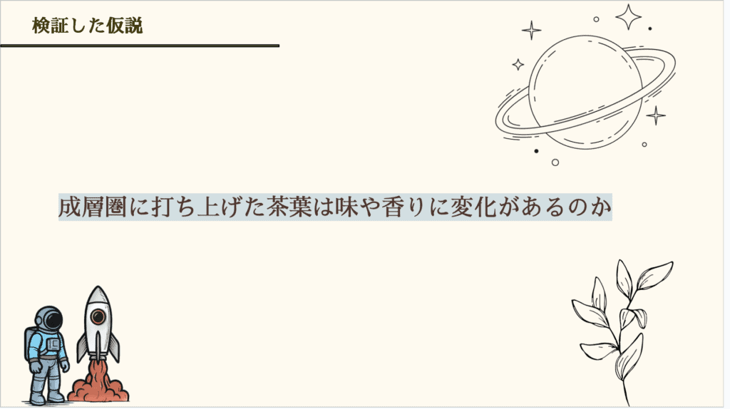 宇宙煎茶団が掲げた仮説は、「成層圏に打ち上げた茶葉は、味や香りに変化があるのか?」というもの。身近なお茶を題材に、成層圏環境が茶葉に与える影響を科学的に確かめる実験を計画しました。