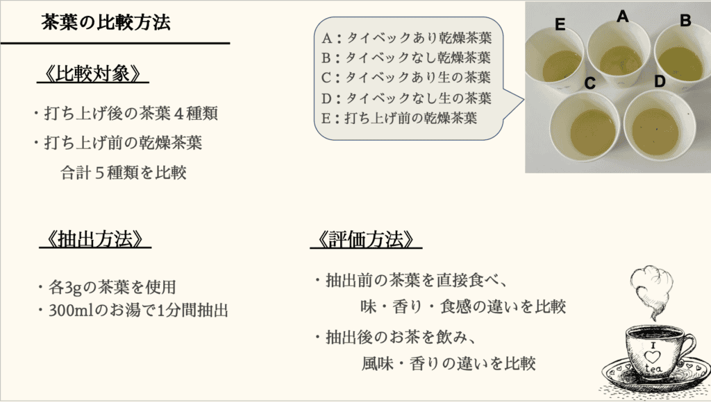 乾燥した茶葉、生の茶葉の2種類に、それぞれ保護材(タイベック)有りのもの、無しのものを準備し、合計4つの条件を設定して成層圏に打ち上げたものに、打ち上げ前の乾燥茶葉を加えた合計5種類の茶葉を用意。抽出する前の茶葉を直接食べ、味・香り・食感の違いを比較する方法と、抽出後のお茶を飲み、風味・香りの違いを比較する2つの方法で検証しました。