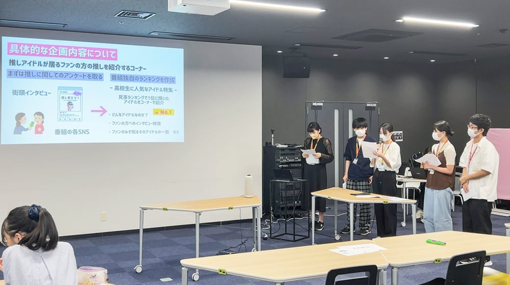 このプロジェクト型学習では、離れた場所にいる生徒同士のコミュニケーションを活性化するため、メタバース空間を活用し、現実世界と仮想空間の両方での学びを通じて意見を共有しました。また、生徒たちは、実際に中京テレビに訪問して放送業界の現場に触れ、現役のアナウンサーから放送業界の最新動向を学び、経験豊富な放送作家から企画書の書き方やリサーチ方法の指導を受講。これらの知識と経験を活かし、チームごとに独自のアイデアを企画書にまとめました。