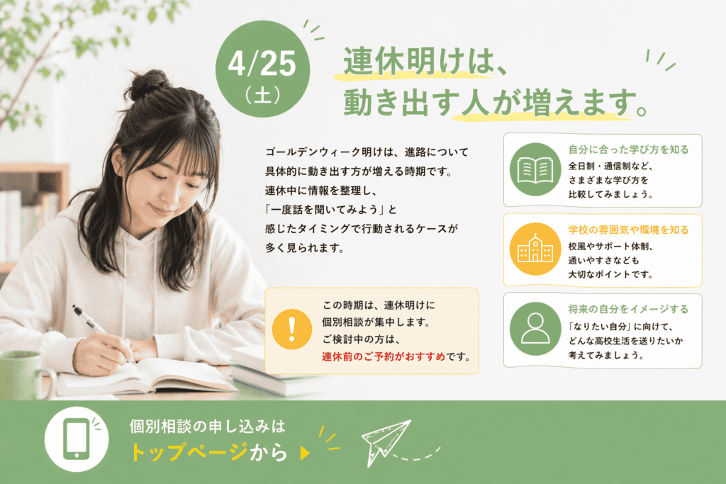 ゴールデンウィーク明けは、進路について具体的に動き出す方が増える時期です。